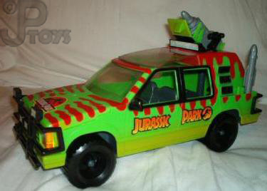Analysis: The Jungle Explorer is without a doubt the most well remembered and iconic vehicle of the entire JP franchise. Everyone fondly recalls this car being beaten, battered, torn to shreds, thrown off a cliff and falling down a tree in a climatic confrontation with a curious Tyrannosaurus in the first movie. Of course kids would want to repeat its behaviour with their own toy vehicle, so Kenner designed this classic Jungle Explorer toy, largely sporting the same great colourful paint job as the car seen in the film.